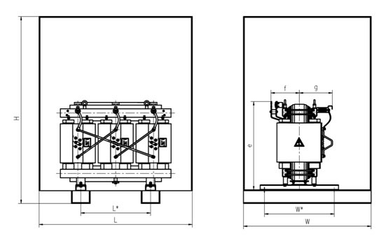 五、外形尺寸圖Overall Dimension Drawing 10kV級SC(B)型干式變壓器外形尺寸圖 Overall dimension drawing of 10kV SC(B) type dry-type transformer |