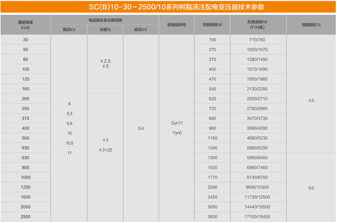 產(chǎn)品特點干式變壓器250KVA315KVA400KVA500KVA630KVA800KVA1000KVA1250KVA1600KVA2000KVA2500KVA 安全:難燃防火,無污染,耐腐蝕性好,可直接安裝在負荷中心。 防潮:可在 濕度下正常運行。 免維護:安裝簡便,綜合運行成本低。 優(yōu)良性能:損耗低,局部放電量低,噪聲小,機械強度高,抗短路能力強,散熱能力強,強迫風(fēng)冷條件下可以130%額定負載運行。 溫控保障:配備有完善的溫度保護控制系統(tǒng),為變壓器安全運行提供可靠保障。據(jù)對已經(jīng)投入運行的產(chǎn)品的運行報告,產(chǎn)品的可靠性指標(biāo)已經(jīng)達到國際先進水平。 使用條件• 海拔≤1000m,-25℃≤環(huán)境溫度≤40℃,戶內(nèi)式。對空氣自冷與強迫風(fēng)冷的變壓器,均需保證變壓器具有良好的通風(fēng)能力。當(dāng)變壓器安裝在地下室或其他通風(fēng)能力較差的環(huán)境,須增設(shè)散熱通風(fēng)裝置。保護等級有IP00、IP20、IP23等型式。 • 當(dāng)海拔>1000米時或是環(huán)境溫度大于40℃或者小于-25℃時,產(chǎn)品須按照GB1094.11《電力變壓器第11部分:干式變壓器》的要求對有關(guān)額定值作相應(yīng)調(diào)整。 技術(shù)參數(shù)